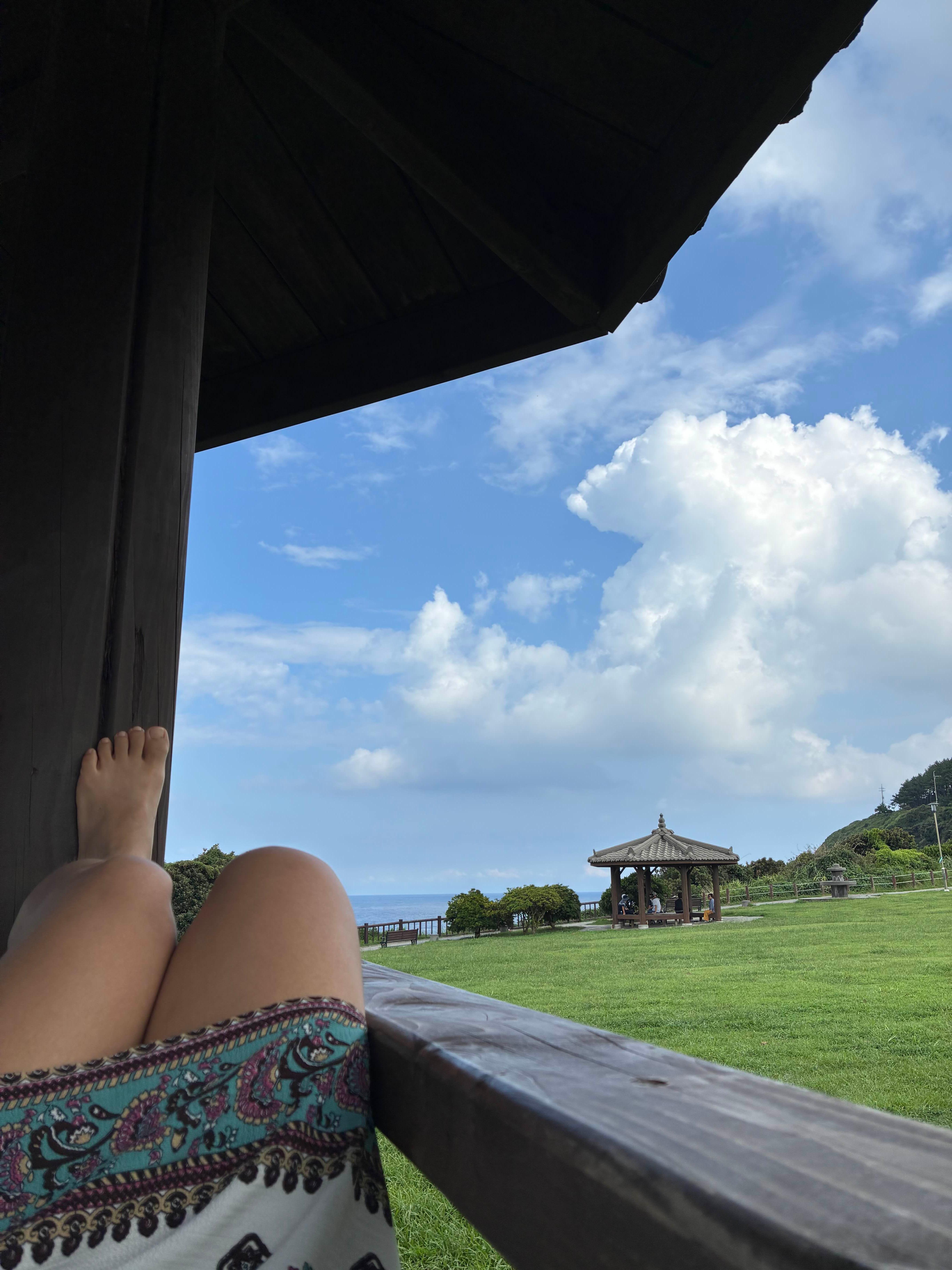 어제까지만 해도 날이 굉장히 습하고 더웠는데, 오늘 아침에 산책을 나오니 바람이 선선하게 느껴졌다. 숙소는 송악산과 산방산 중간쯤에 있었는데, 다른 건물도 없고 중간에 오름도 없이 탁 트인 시야를 보장하는 곳이었다. 아무것도 없었는데도 시원한 바람을 맞으며 걷는 길이 매우 기분이 좋았다. 전복죽을 조식으로 먹고 C언니가 일하는 동안, 나는 2층 테라스의 그늘에 앉아 체크아웃 시간 전까지 여유를 즐겼다. 아침 산책 때는 산방산이 구름 모자를 쓰고 있었는데, 시간이 흐르며 해가 뜨면서 모자가 엔젤링이 되어가고 있었다. 오늘은 C언니가 커피 타령을 했는데, 찜해둔 카페를 가던 중에 떡집에 들렀다. 주차한 차를 빼면서 봉에 차를 긁었다. 괜찮다, 괜찮다 스스로 타일렀지만 좀처럼 속상함이 가시진 않았다. 게다가 원래 들르려 했던 카페의 주차 공간이 마땅치 않아 다른 곳으로 이동했다. 바다가 멋지게 보이는 카페였다. 처음엔 조용했는데, 갑자기 버스 두 대가 오더니 아주 시끌시끌했다. C언니는 일을 해야 했고, 나는 책을 읽어야 해서 자리는 옮기지 않았다. 밝은 대낮에, 아주 멋진 풍경에서 공포소설을 읽다 보니 그다지 무섭게 느껴지진 않았다. 점심은 송악산 근처의 해물라면집에 가기로 했다. 제주에서만 먹을 수 있는 요리는 거의 먹은 셈이라 동의하며 별 기대 없이 갔는데, 같이 시킨 전복치즈밥이 너무 맛있어서 좀 놀랐다. 어제는 비가 그렇게 왔는데 오늘은 날씨가 아주 좋아 풍경을 보기에 딱이었다. 예전에 송악산을 가본 우리는, 송악산에 올라가기 전 산방산이 잘 보이는 위치에 앉아 바람을 느끼며 풍경을 즐겼다. 10년 전에 왔을 때도 송악산에서 바라보는 산방산이 참 좋았는데, 이번에도 같은 느낌을 받아 다음에도 또 오고 싶었다. 나는 정자에 누워 계속 책을 읽었다. 전자책으로 1000페이지 책인데 400페이지까지 겨우 읽었다. C언니가 가보고 싶은 장소들이 있다고 해서, 차 반납 시간을 고려해 4시에 자리를 떴다. 중산간의 멀리 산방산이 보이는 카페에서 커피 한 잔을 하고, 이타미준의 방주 교회를 한 바퀴 돌아본 뒤 차를 반납하고 공항으로 이동했다. 차 반납 시간과 수하물을 부치는 시간이 잘 맞지 않아 고민하다, 우리는 저녁을 떡과 막걸리로 대신하기로 했다. 공항 라운지에 얼음컵을 사서 시원한 막걸리 한 잔을 하며 하늘이 캄캄해질 때까지 이런저런 이야기를 하며 시간을 보냈다.